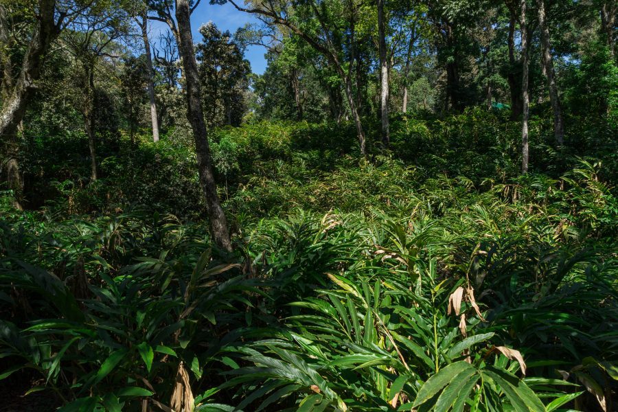Kadamompflanzen wachsen direkt neben der Straße flächendeckend unter den Bäumen.
