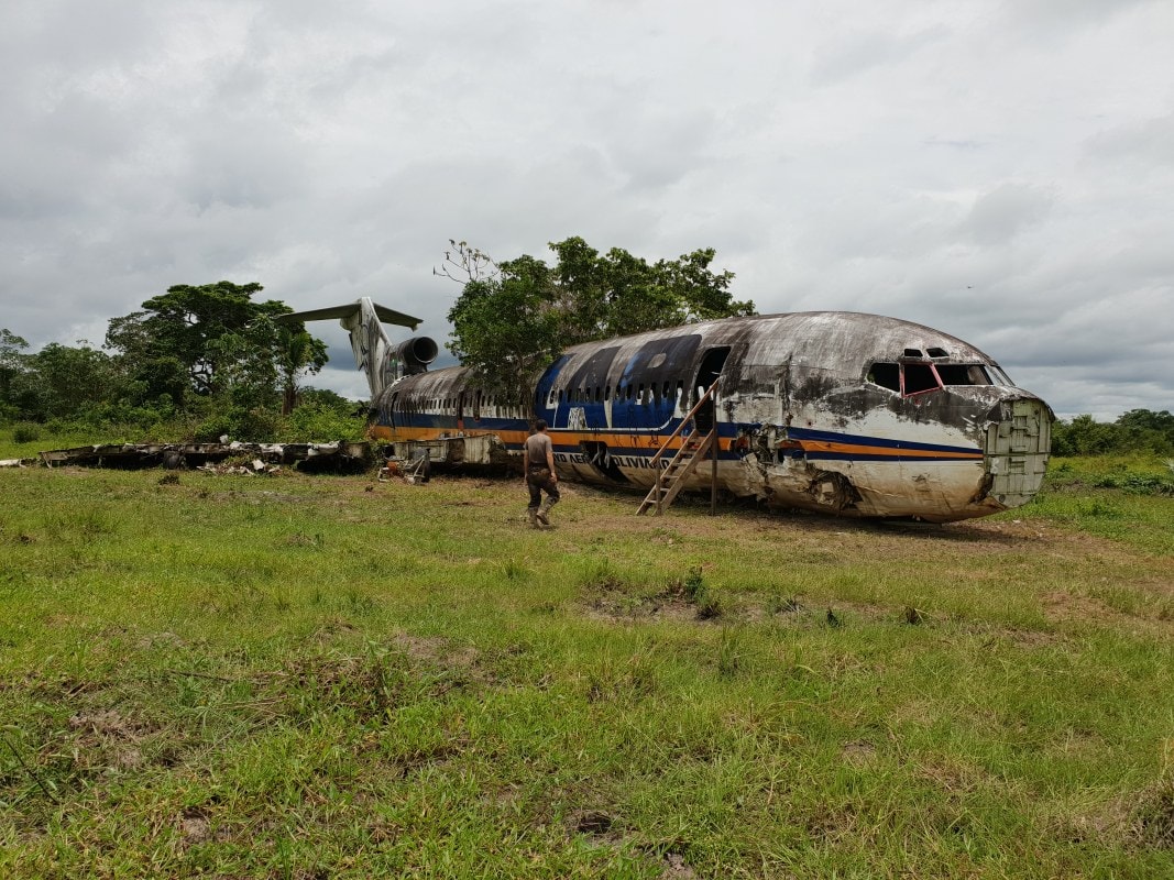 Kurz vor der Landebahn des Flughafens Trinidad liegt im Urwald eine 2008 abgestürzte Boeing 727-200.